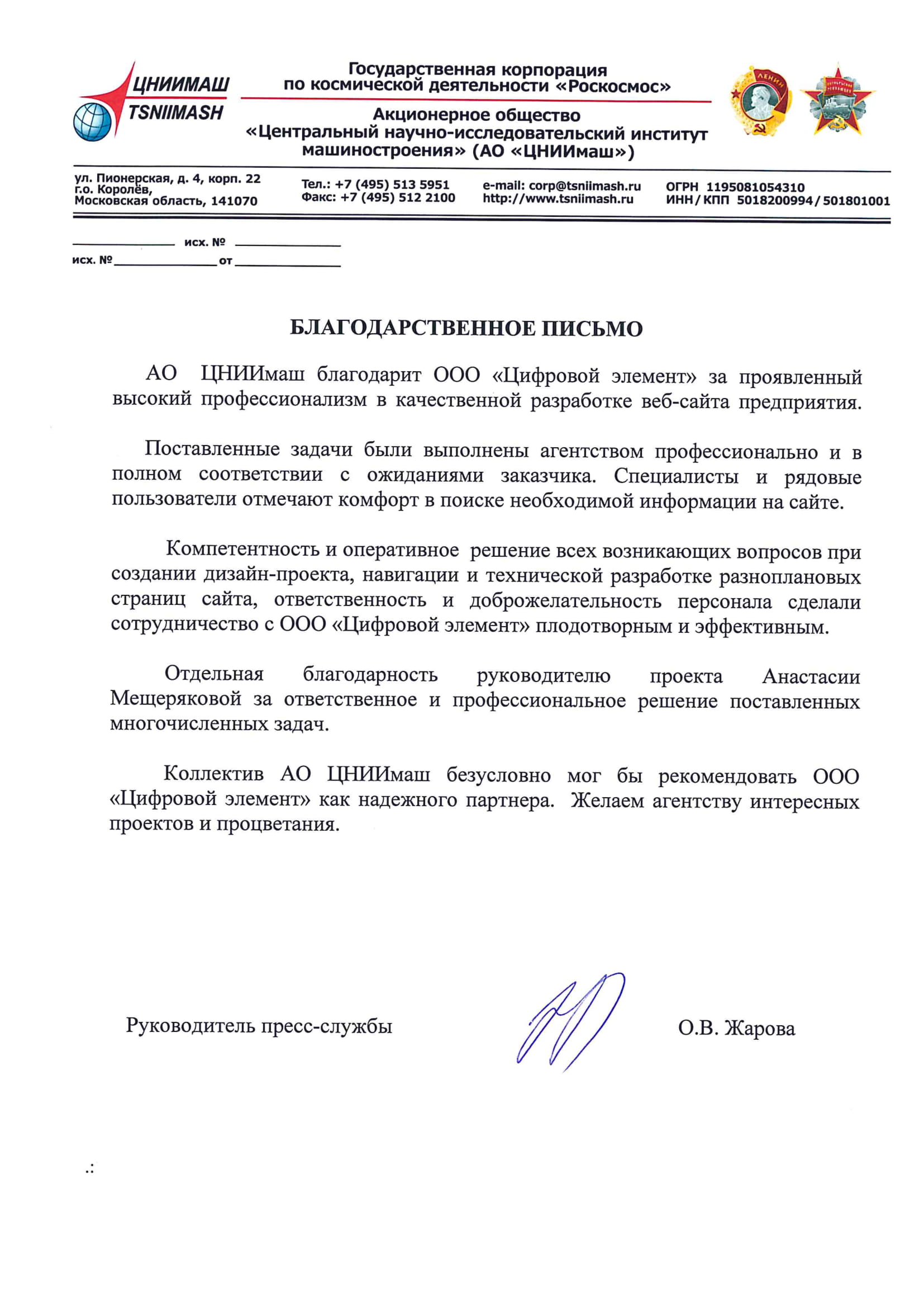 АО ЦНИИмаш благодарит ООО «Цифровой Элемент» за проявленный высокий профессионализм в качественной разработке веб-сайта предприятия. Поставленные задачи были выполнены агентством профессионально и в полном соответствии с ожиданиями заказчика. Специалисты и рядовые пользователи отмечают комфорт в поиске необходимой информации на сайте. Коллектив АО ЦНИИмаш безусловно мог бы рекомендовать ООО «Цифровой Элемент» как надёжного партнёра. Желаем агентству интересных проектов и процветания.