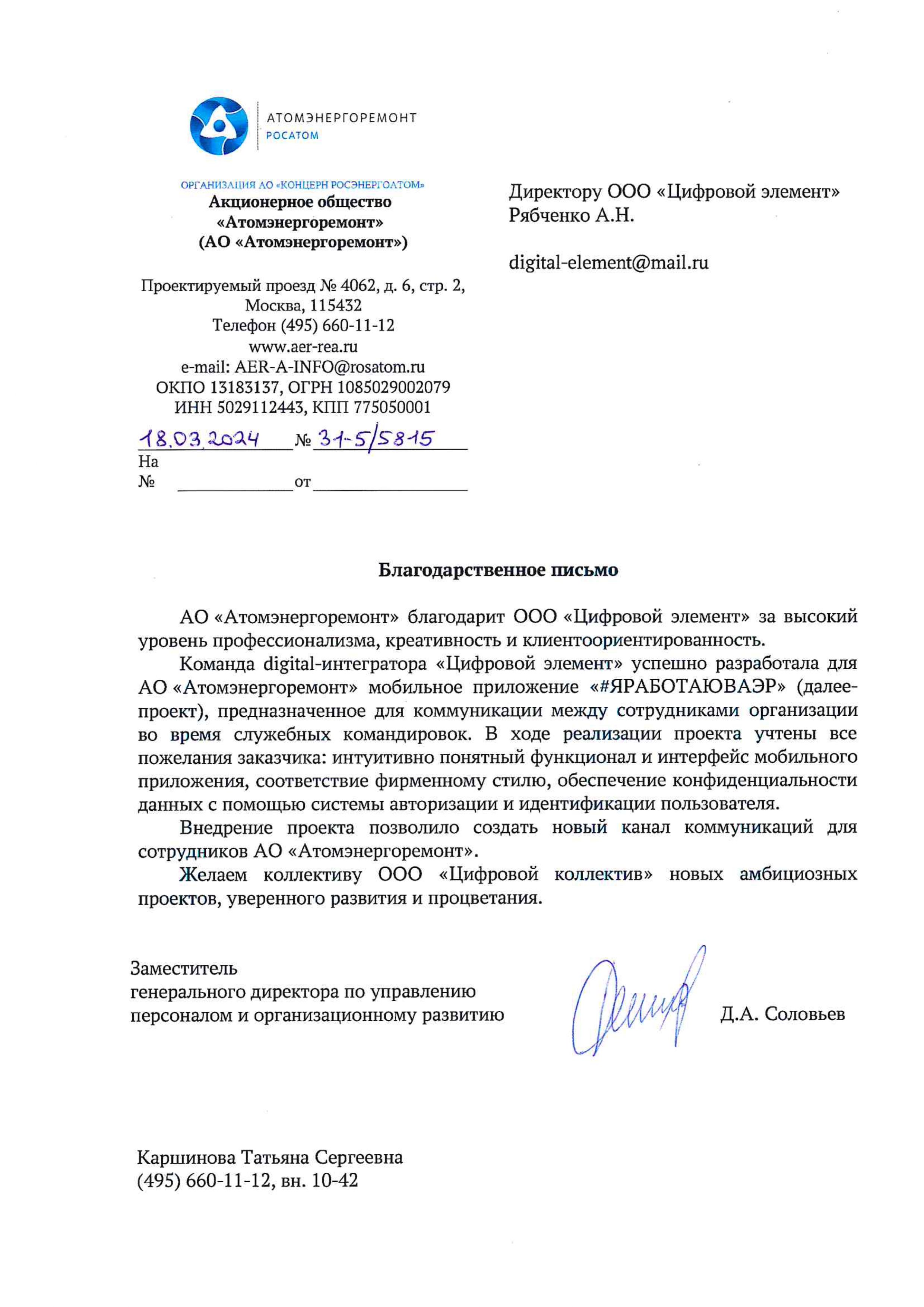 АО «Атомэнергоремонт» благодарит ООО «Цифровой элемент» за высокий уровень профессионализма, креативность и клиентоориентированность.