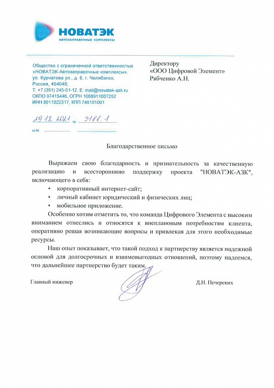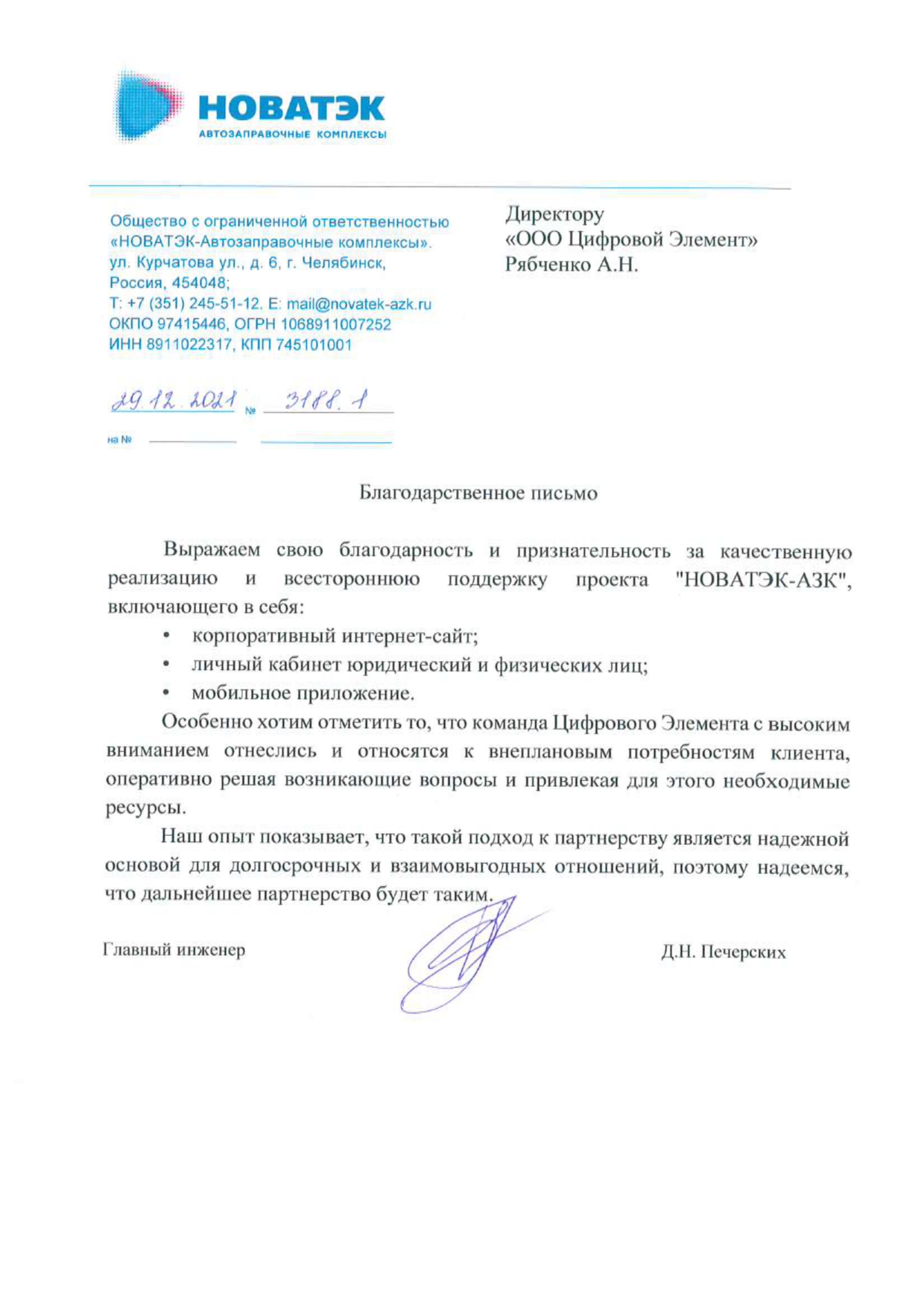 Выражаем свою благодарность и признательность за качественную реализацию и всестороннюю поддержку проекта «НОВАТЭК-АЗК», включающего в себя: корпоративный интернет-сайт, личный кабинет юридических и физических лиц, мобильное приложение. Особенно хотим отметить то, что команда Цифрового элемента с высоким вниманием отнеслись и относятся к внеплановыми потребностям клиента, оперативно решая возникающие вопросы и привлекая для этого необходимые ресурсы.