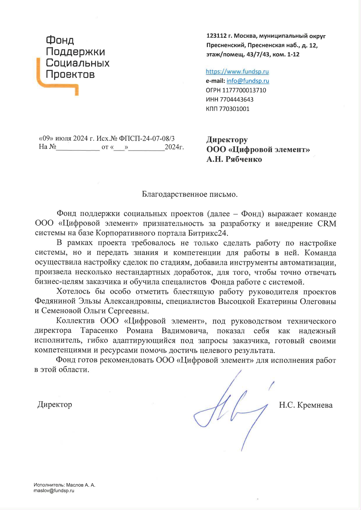 Фонд поддержки социальных проектов (далее - Фонд) выражает команде ООО «Цифровой элемент» признательность за разработку и внедрение CRM системы на базе Корпоративного портала Битрикс24.