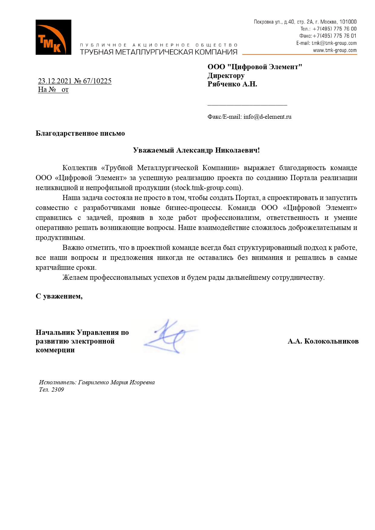 Коллектив «Трубной Металлургической Компании» выражает благодарность команде ООО «Цифровой Элемент» за успешную реализацию проекта по созданию Портала реализации неликвидной и непрофильной продукции. Наша задача состояла не просто в том, чтобы создать Портал, а спроектировать и запустить совместно с разработчиками новые бизнес-процессы. Команда ООО «Цифровой Элемент» справились с задачей, проявив в ходе работ профессионализм, ответственность и умение оперативно решать возникающие вопросы. Наше взаимодействие сложилось доброжелательным и продуктивным.