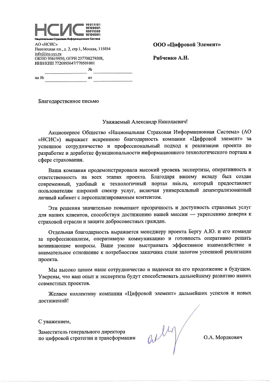 АО «НСИС» выражает искреннюю благодарность компании «Цифровой элемент» за успешное сотрудничество и профессиональный подход к реализации проекта по разработке и доработке функциональности информационного технологического портала в сфере страхования. Благодаря высокому уровню экспертизы, оперативности и ответственности на всех этапах работы был создан современный, удобный и технологичный портал nsis.ru, предоставляющий пользователям широкий спектр услуг, включая универсальный децентрализованный личный кабинет с персонализированным контентом.