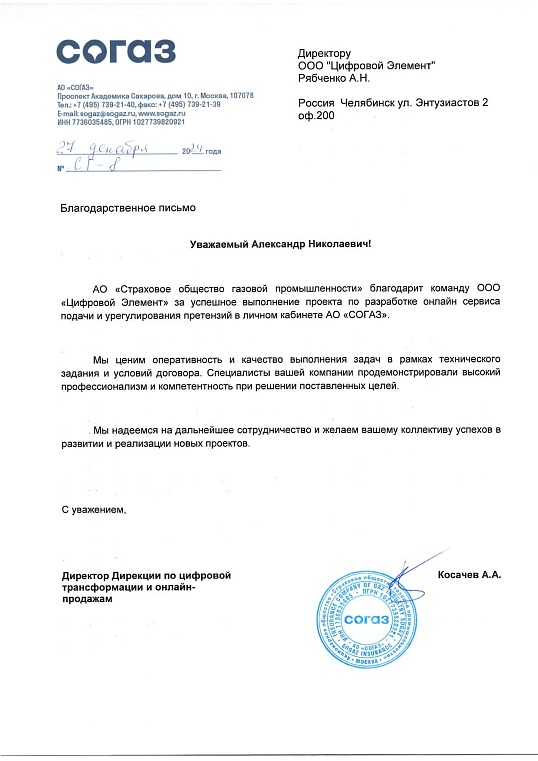АО «Страховое общество газовой промышленности» благодарит команду ООО «Цифровой Элемент» за успешное выполнение проекта по разработке онлайн сервиса подачи и урегулирования претензий в личном кабинете АО «СОГАЗ». Мы ценим оперативность и качество выполнения задач в рамках технического задания и условий договора. Специалисты вашей компании продемонстрировали высокий профессионализм и компетентность при решении поставленных целей.
