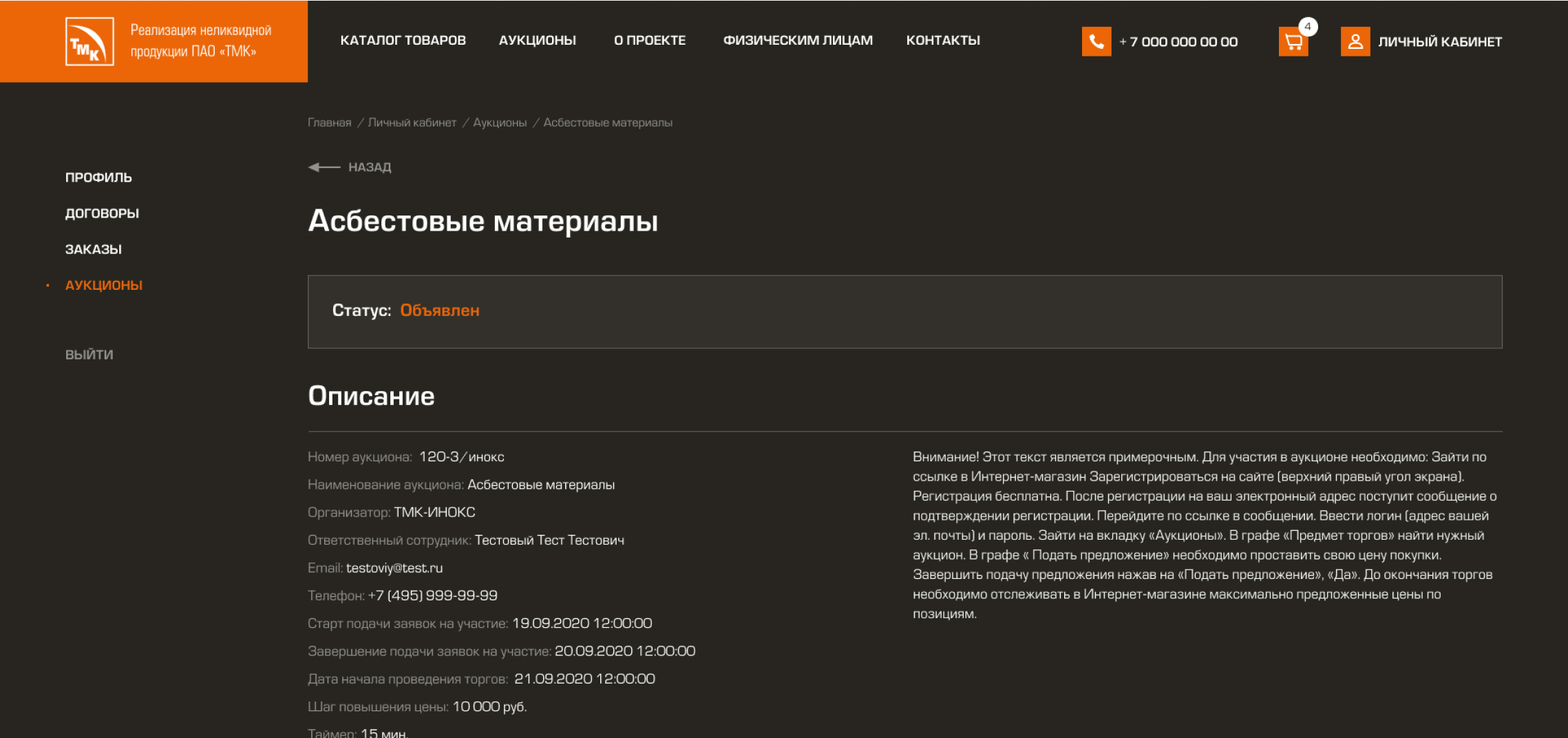 • После публикации - аукцион становится доступен для просмотра всем пользователям, а авторизованные контрагенты могут подать заявку на участие в нем.